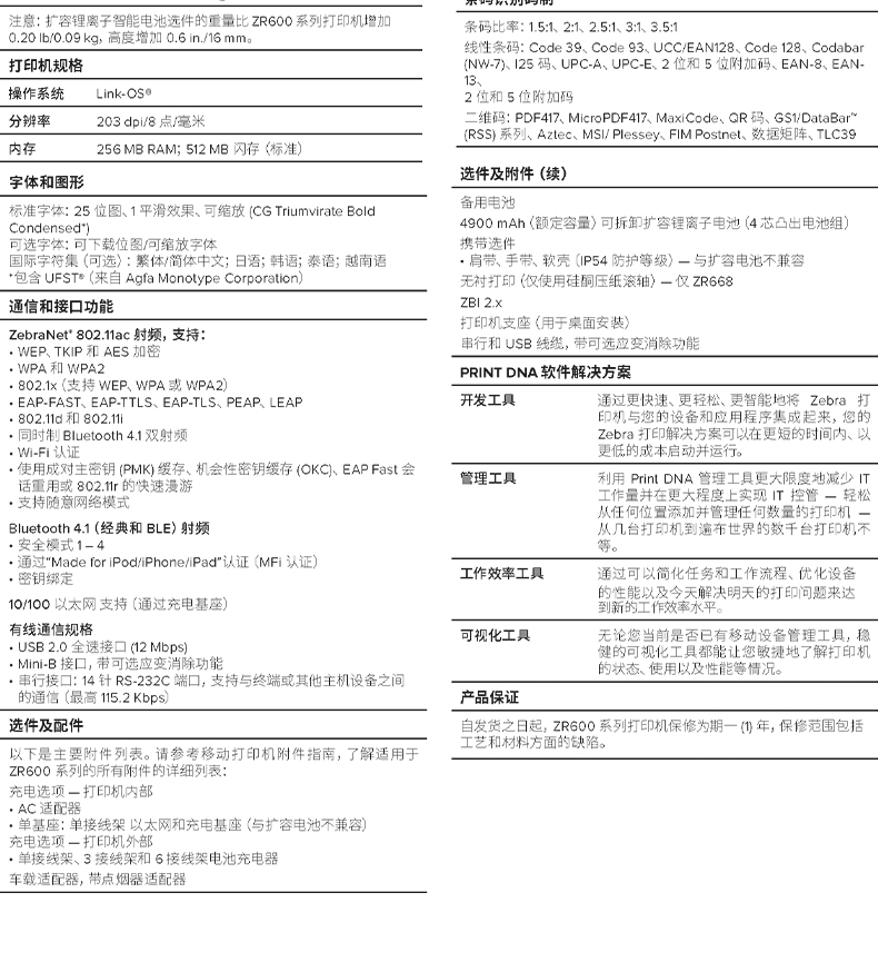 ZEBRA 斑马蓝牙便携打印机 无线条码标签打印机 ZR668 蓝牙WIFI版 (72mm宽)