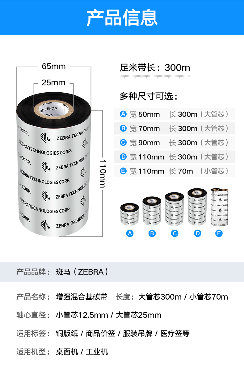 ZEBRA 斑马混合基碳带条码标签打印机专用色带 90*300M(工业机专用)