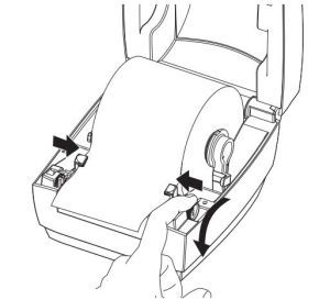 使用另一只手将介质卷支架拉开,将介质卷放在纸卷支架上,并松开。调整成卷介质方向,使其在通过打印 (驱动)辊上方时打印面朝上。